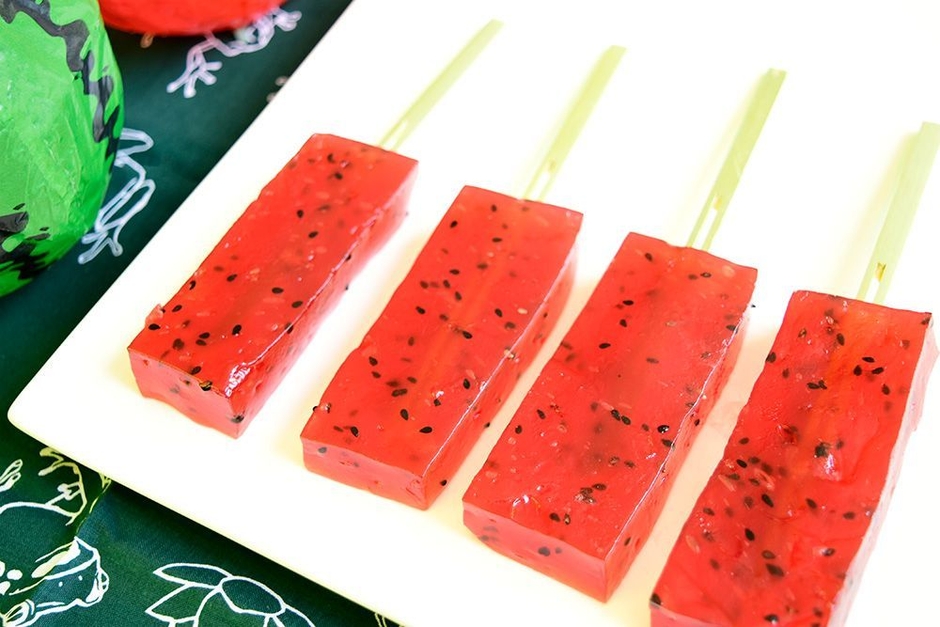 透きとおる赤いわらび餅にすいかの種をイメージして入れた黒ゴマ、一口頬張るとプルプルもちもちとした食感にすっきりと甘いすいか味のわらび餅。一本一本食べやすいように串に刺してあるので、アイスキャンディーのように片手で美味しくいただくことができます。よく冷やして暑い夏においしさを楽しめる一品に仕上がりました。