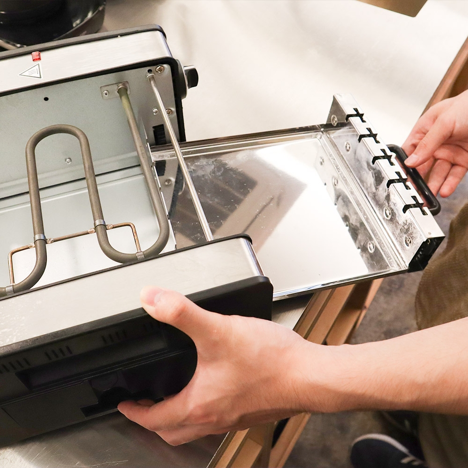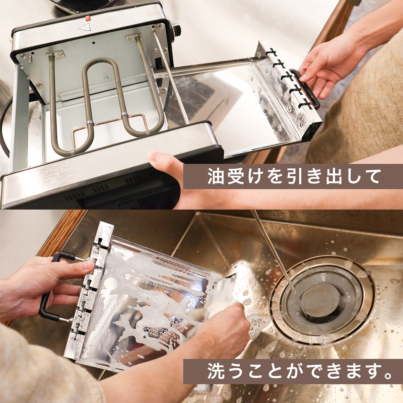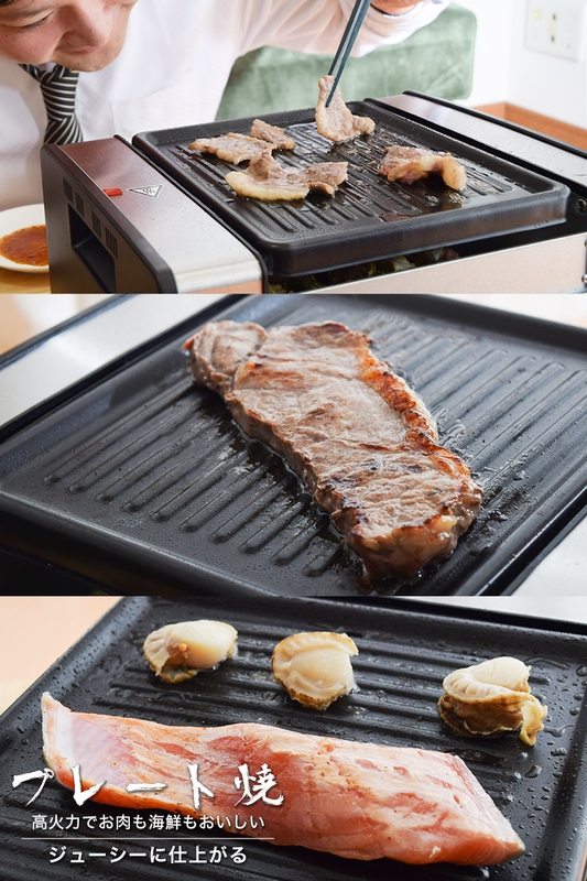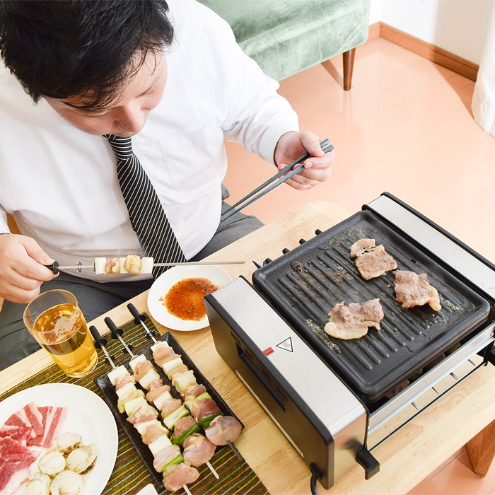 ヒーターは3段階(LOW:約230-240度 MID: 約 245-255度 HIGH:約260度※プレート温度)切り替えで好みの温度で焼き上げられます。プレート部分には油が落ちる穴があり、本体の油受けに自動で溜まります。食材の油が直接ヒーターに付かない構造で、焼肉プレートでも串焼でも煙がほとんど出ない構造。プレートや串をセットするトレーなどは外して楽に洗うことが可能。