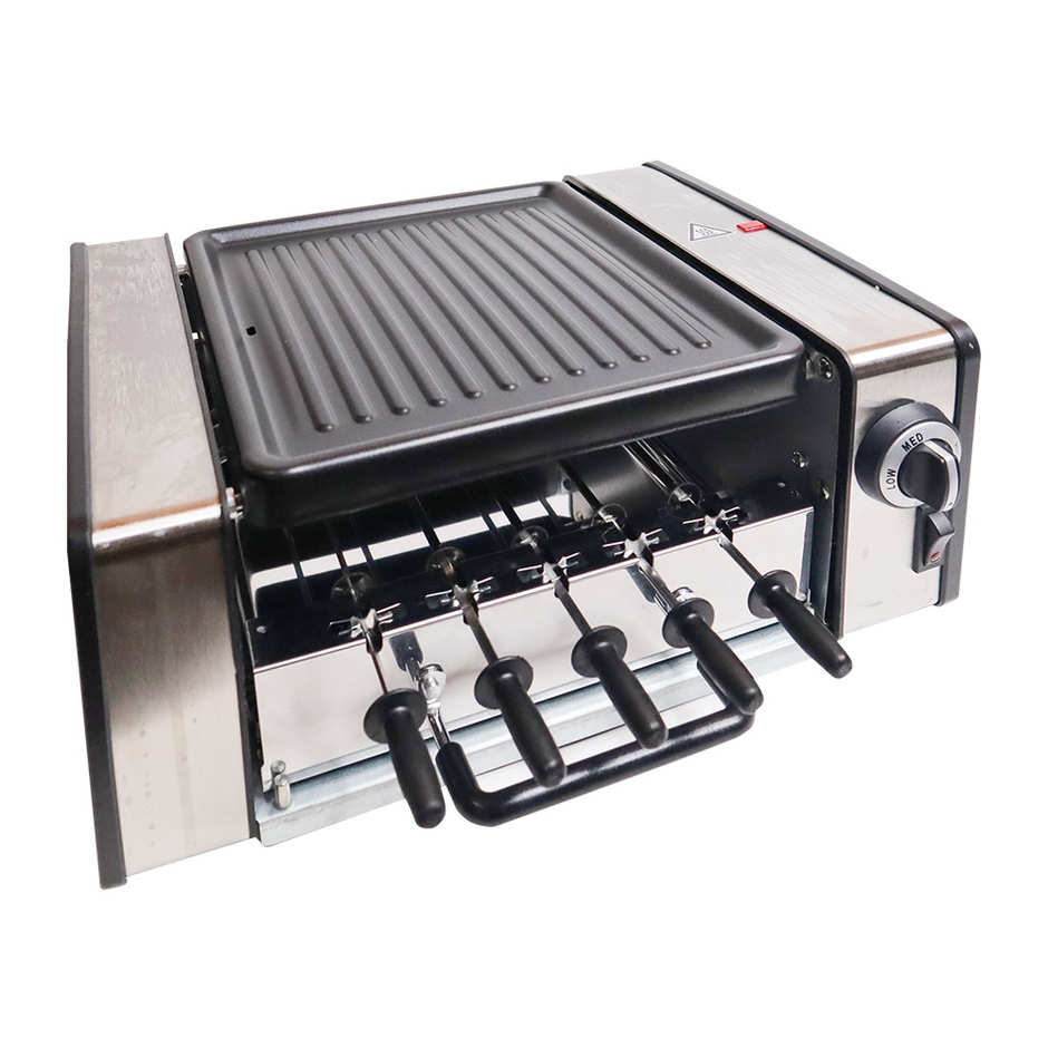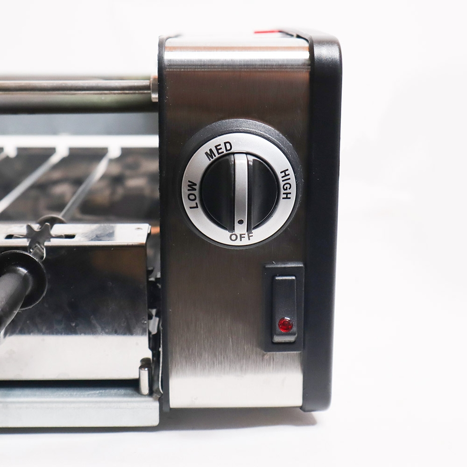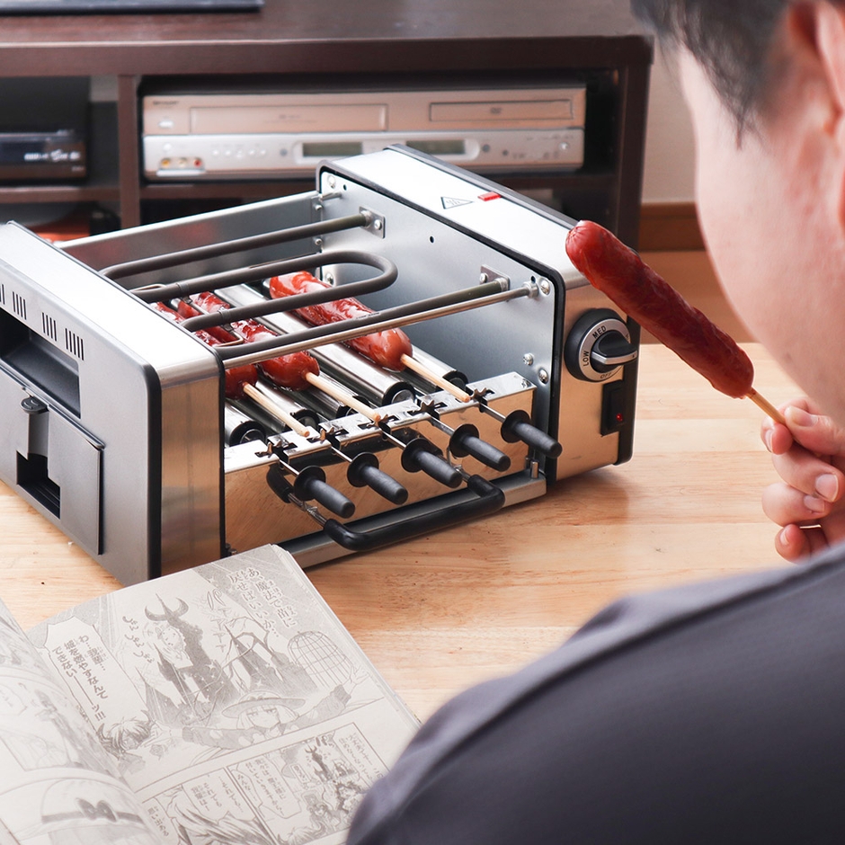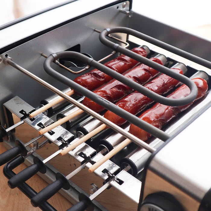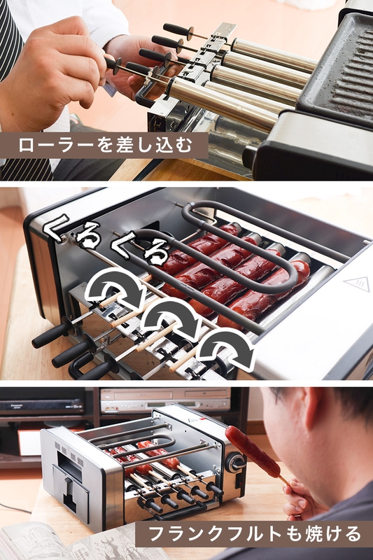 本体の真ん中部にヒーターがあり、ヒーターの上にプレートをのせて焼肉が楽しめます。ヒーターの下部分には付属の串を5本までセットでき、回転スイッチをオンにすれば串を自動で回転しながらムラなく美味しいふっくらしとした焼き鳥や串焼を楽しむことが可能。さらに付属のローラーをセットすれば、ローラーの上にフランクフルトなども美味しく焼くことが出来ます。