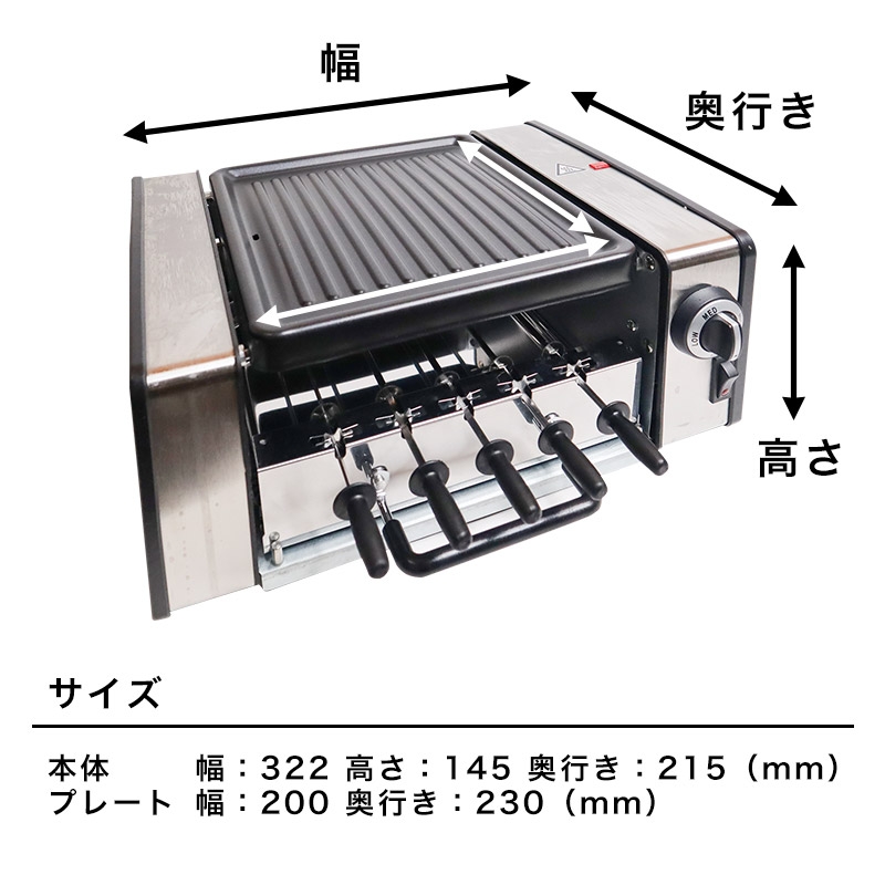 本製品は鉄板で焼き肉を楽しみながら同時に自動で回転して美味しく焼き鳥が焼ける焼き鳥&焼肉プレートです。高さ145×幅322×奥行き215mmで卓上に置けるコンパクトサイズ。