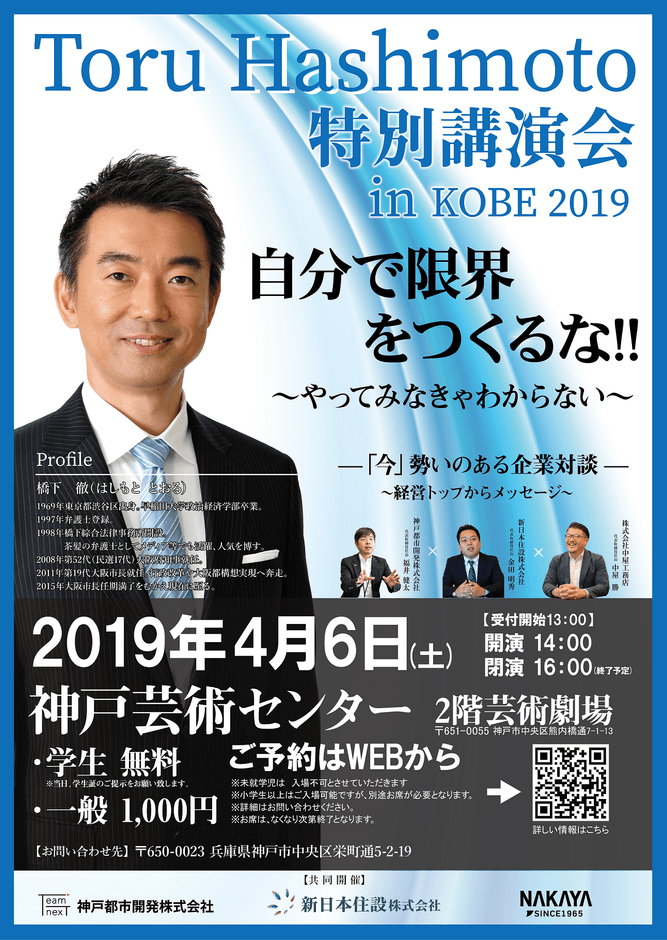 この度、神戸都市開発株式会社(所在地:兵庫県神戸市、代表取締役:福井健太)と新日本住設株式会社(所在地:兵庫県神戸市、代表取締役:金田明秀)、株式会社中屋工務店(所在地:大阪府摂津市、代表取締役:中屋勝)は共同で、2019月4日6日(土)に元大阪府知事の橋下徹氏を招いた就活生向けセミナーを開催いたします。