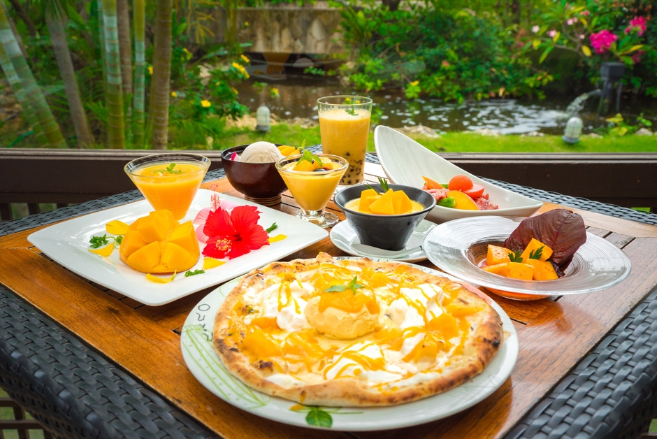 シギラリゾートではこの時期だけのお楽しみとして、旬のアップルマンゴーを贅沢に使った様々なメニューをご提供する『南国マンゴーフェア2017』を開催いたします。もっちり焼き上げたピザ生地の上に新鮮なカットマンゴーと冷たいバニラアイスをトッピングし、最後に甘酸っぱい濃厚マンゴーソースをかけて仕上げたデザート感覚で味わえる「マンゴーピザ」をはじめ、果肉をたっぷり使った口溶けなめらかな「マンゴープリン」や、タピオカの食感が愉しい「マンゴーとブラックタピオカのラッシー」、さらにはマンゴーの甘酸っぱさと唐辛子の辛さが絶妙に絡み合う「マンゴーのキムチ」など多彩なオリジナルメニューをご用意。アップルマンゴーの美味しさを存分にご堪能いただけます。