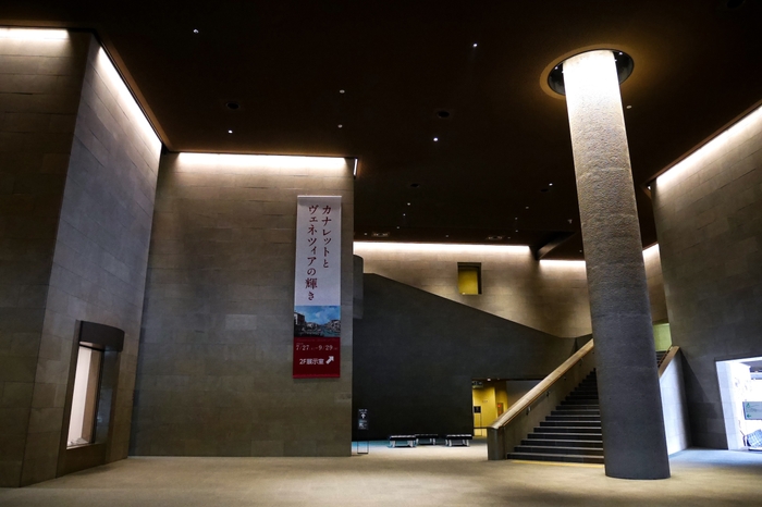 美術館の低めのエントランスは茶室の躙口をイメージしており、その先には大きな柱が聳える大空間が広がります。縦型に設けられた窓は掛け軸にも見え、涼やかな竹林の風景が切り取られています。また、名品コーナーには常時3点の収蔵品を展示しており、展覧会を鑑賞しなくても作品に触れることができます。