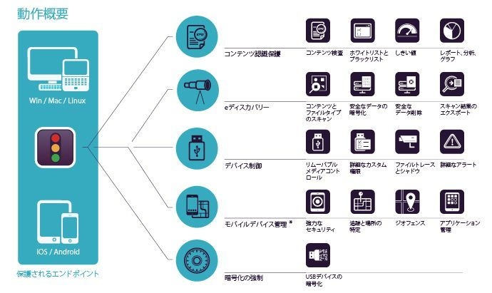 エンドポイント(Windows, Mac, Linux)をサポートするマルチプラットフォーム製品で、「デバイス制御」、「コンテンツ認識保護」、「eディスカバリー」、「モバイルデバイス管理」、「暗号化の強制」の各モジュールで構成されます。