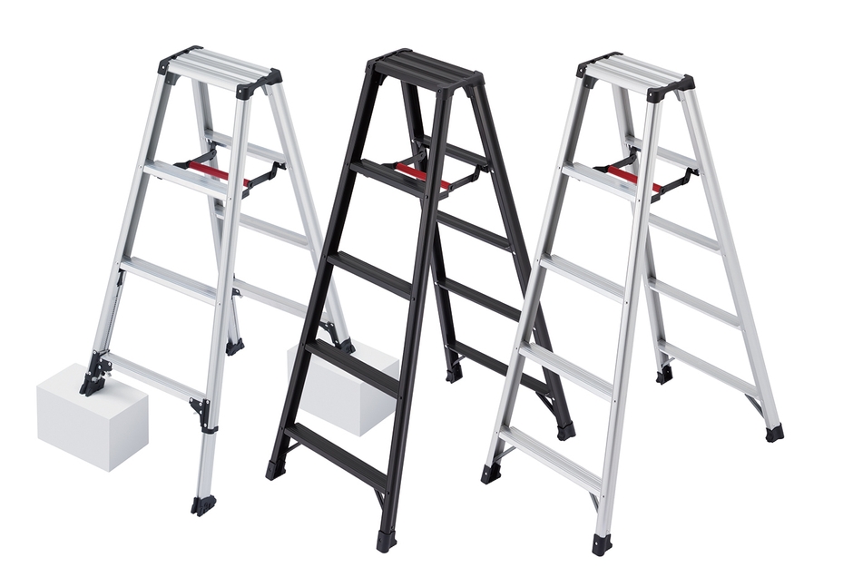 リニューアルは、当社の特許技術である天板トレー形状を採用し、工具などを天板に置けることで作業効率を高めることが出来ます。また、踏ざんにはリブを強化することで、滑り止め効果が向上し安全な昇降を実現します。支柱端具はP・V・C(ポリ塩化ビニール)素材で柔らかくすることで、閉じる際の音を軽減し使い心地のよい仕様に変わりました。