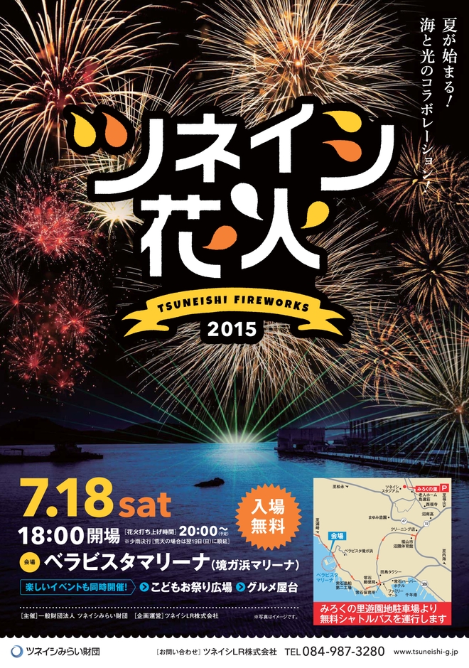 また同日の駐車場は、三世代テーマパークみろくの里をとしており、みろくの里から会場までは無料のシャトルバスを運行します。「ツネイシ花火」は、雨天の場合は翌日に順延開催します。