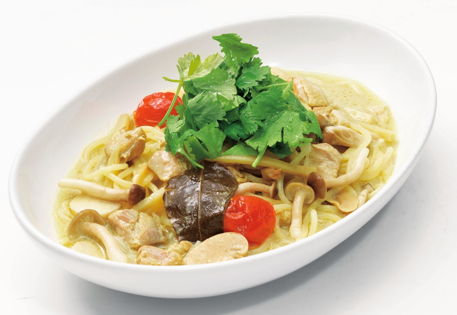 チキンがたっぷり入ったカレーにきのこやトマトなどの野菜を加えてボリュームも満点。刺激的な辛さの本格タイカレーにパクチーが香る新感覚のパスタです。