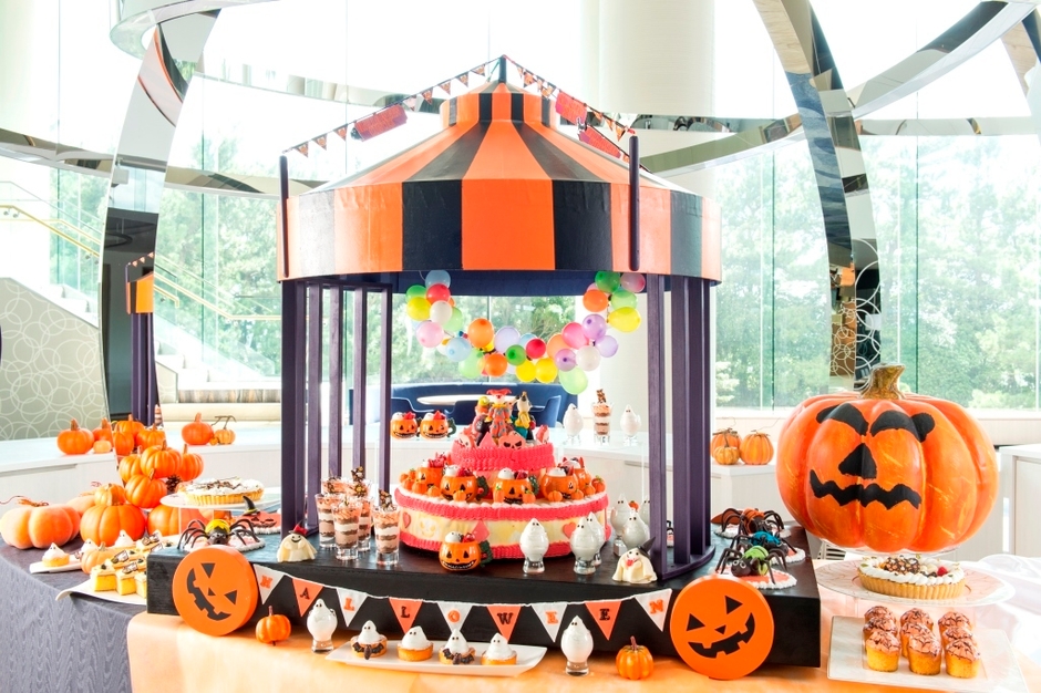 暑い夏が終わりを告げ、心地よい秋の訪れを感じ始める9月、一足早くハロウィーン気分が楽しめるデザートブッフェを提供します。サーカス一団が開くハロウィーンパレードをイメージしたブッフェ台の中で一際目を引くのは、カボチャの車輪が可愛いサーカステント。テントの周りには、ポップでかわいいハロウィーンデザートが並びます。