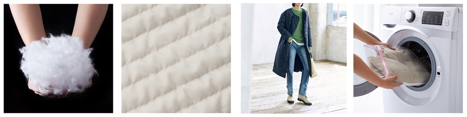 fill warmyの特長である、「(1)ダウン90%と同等の温かさ、(2)洗濯機で洗えるイージーケア性、(3)長期保管やデイリーユースに嬉しい抗菌防臭・防ダニ機能」はそのままに、ダウンや中わた特有の着ぶくれを感じさせない、すっきりとしたデザインにもこだわりました。