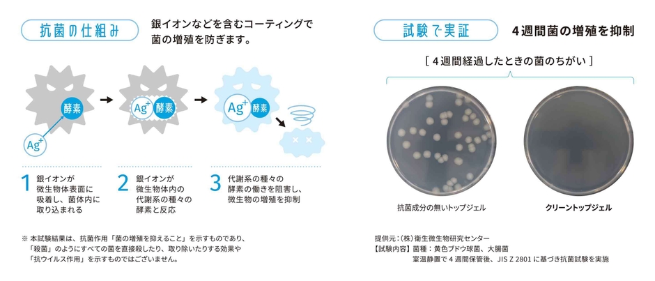 「クリーントップジェル」はジェルネイルの仕上げに使用するトップジェルに抗菌作用をプラスした新製品です。銀イオンなどを含むコーティング剤により、菌の増殖を抑制します。(※)第三者機関である衛生微生物研究センターの調査により、4週間にわたり菌の増殖を抑える働きが認められました。(図参照)いつものようにネイルのお洒落を楽しみながら、ジェルをオフするまで菌の増殖を防ぎ、常に清潔な爪先をキープすることができます。普段ネイルをされる習慣がない方、日々さまざまな物に触れる指先を清潔に保ちたい方、衛生管理が特に必要な職業に就かれている方にもおすすめです。ジェルネイルをしながら清潔な爪先を保ち、手指衛生の意識を高めることで、ネイル文化の新しい可能性と発展に寄与します。
