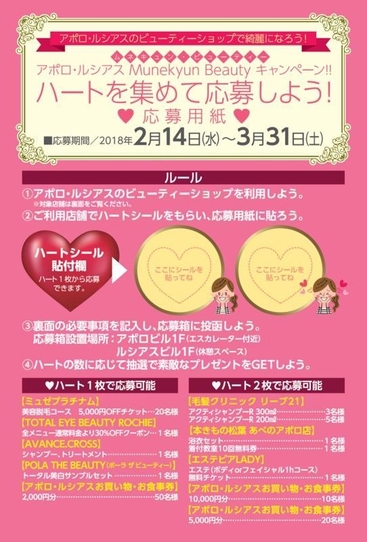 ネスなどのビューティー系ショップが一堂に会しコラボするキャンペーン「アポロ・ルシアスのビューティーショップで綺麗になろう!アポロ・ルシアス Munekyun Beauty キャンペーン!!」を本年2月14日(水)から3月31日(土)まで開催しますのでお知らせ致します。