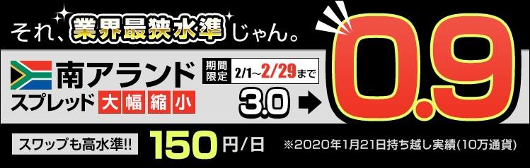 人気の高金利通貨ペア、南アフリカランド/円のスプレッドを通常の3.0銭から業界でも最狭水準となる0.9銭へと大幅縮小するキャンペーンを開始することを決定いたしました。スワップポイントでの収益だけでなく、短期の売買でも収益機会を狙える環境をご提供いたします。