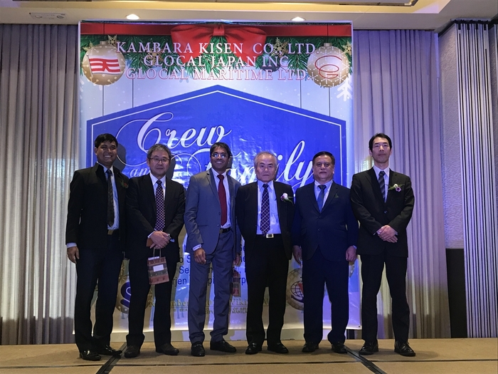 パーティは、神原汽船、グローカルジャパン、グローカルマリタイムの他、Union Marine Management Services、Astro Shipmanagement、Sejin Lines、Virjen Shippingから約400人が参加。常石グループの事業案内やグローカルジャパンの船員からのビデオレターなどの映像が流れる中、参加者は歓談を楽しみました。