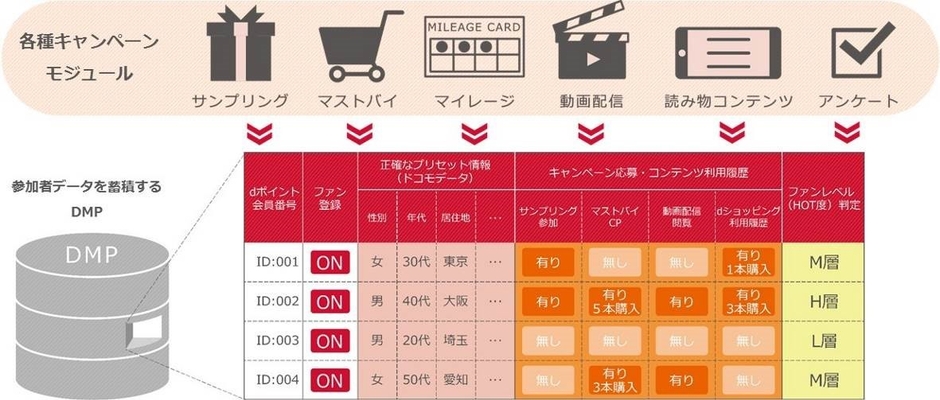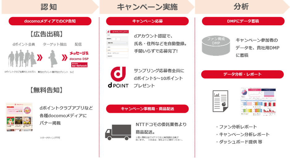 なお、NTTドコモメディア内でのキャンペーンは、商品サンプリング/マストバイ/マイレージ/動画配信/読み物コンテンツ/アンケートなどをご用意。ご要望により、追加も検討しております。