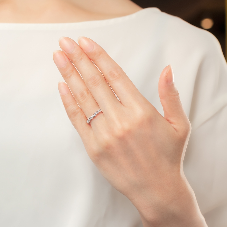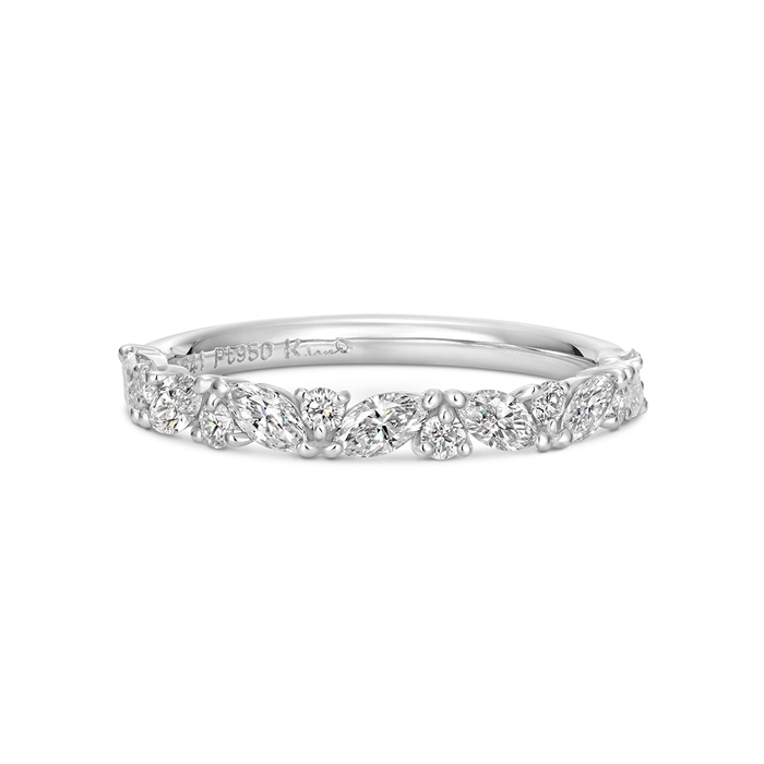 優雅さとシャープさを併せ持つマーキスカットと、ラウンドカットのダイヤモンドを“葉っぱ”と“実”に見立てて、交互にちりばめたスタイリッシュで洗練されたハーフエタニティリング。リズミカルな石の配列が、シンプル・王道のハーフエタニティにさり気なく個性と遊び心をプラスしています。日常使いもできるブライダルリングとしてはもちろん、結婚記念日など節目のアニバーサリージュエリーとして身に着けていただける特別感のあるリング。重ね着けした際に石が当たらないよう、石を留める爪の位置や大きさを調整するなど、使い心地にもこだわって1点1点職人が手作りしています。