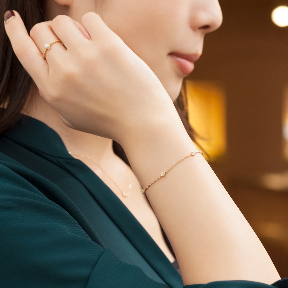 定番人気のダイヤモンドジュエリー「twinkle」に、ブレスレットが登場。上質なメレダイヤモンド0.02ctを6ピース使用した、華やかなブレスレット。ダイヤ型モチーフのシンプル&華奢なデザインは、コーディネートを選ばず上品に身に着けていただけます。