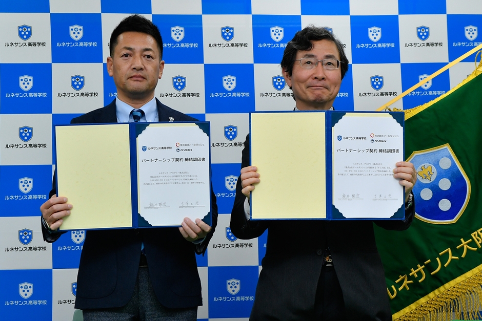 ルネサンス・アカデミー株式会社(本社:茨城県大子町、代表取締役社長:桃井 隆良)は、プロサッカークラブ「FC大阪」のトップパートナーとして応援するスポンサー契約を、「FC大阪」を運営する株式会社アールダッシュ(本社:大阪府大阪市、代表取締役社長:疋田 晴巳)と締結し、2018年1月11日にその調印式を行いました。
