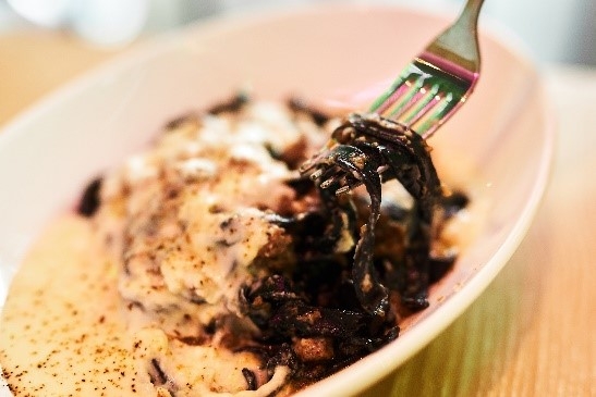 ①ボロネーゼチーズソースの黒パスタ Mサイズ:1,000円、Lサイズ:1200円