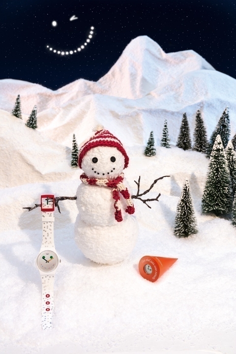 文字盤にはユニークな雪だるまが描かれており、笑顔がカラフルなストーンで輝きます。一方の針は人参の形をしており、可愛らしくデザインされています。