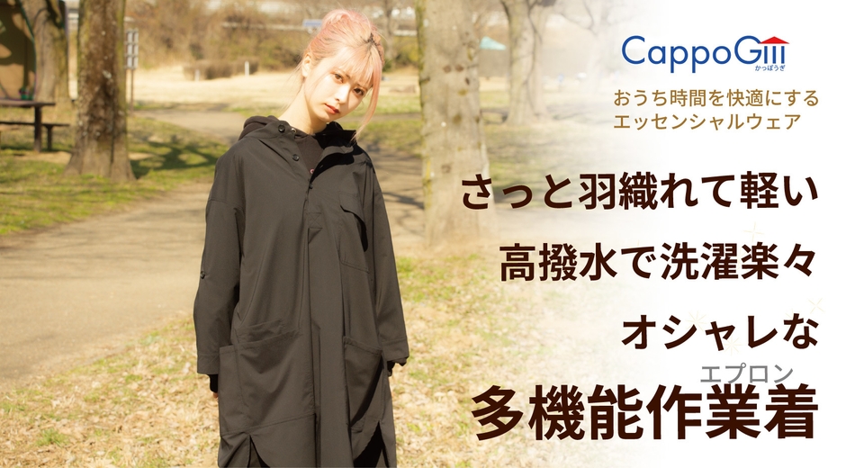 昨今増えた「おうち時間」をさらに快適に過ごせるように、「着ることが苦にならず」「汚れに強く、手入れが簡単」なホームウェアはないかと考え、エプロンや割烹着のように気軽に羽織れて、全体をカバーでき機能性が高いオシャレな作業着ウェアシリーズ「CappoGiii」を開発いたしました。