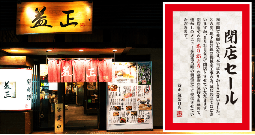 株式会社益正グループが運営する大衆居酒屋、益正 博多駅筑紫口店は、JRの地下新幹線の機械室工事により、2020年8月末に閉店することが決定しました。