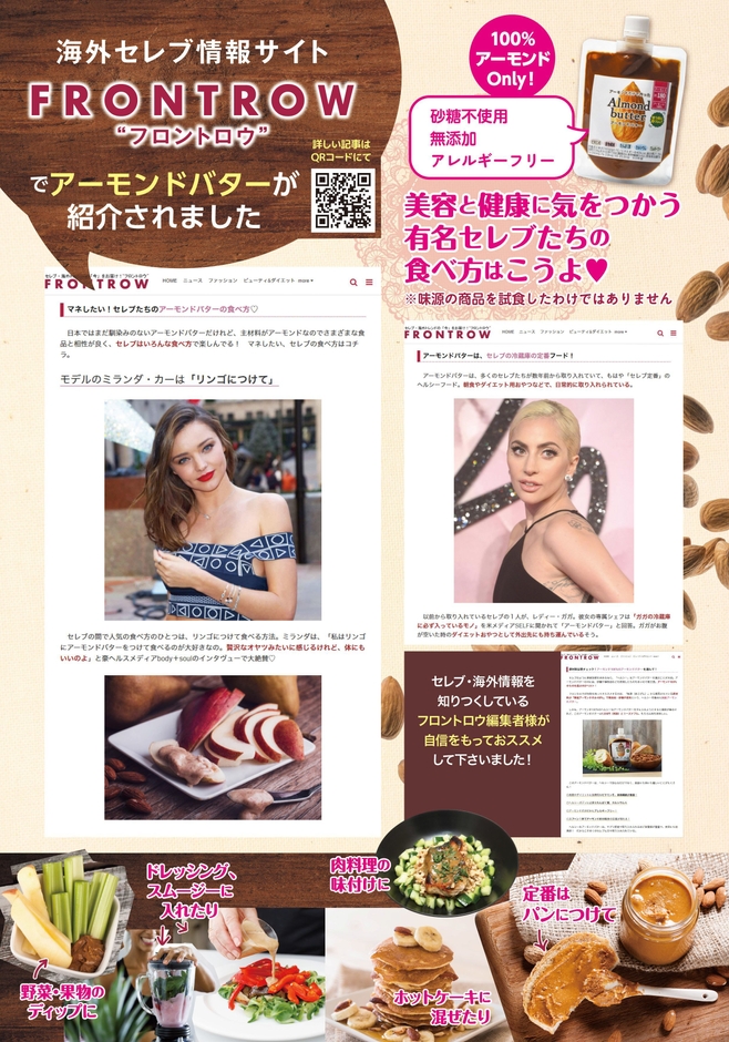 美しいスタイルで美の頂点をキープし続ける海外セレブたちも、日常的に「アーモンドバター」を取り入れています(※)。そんなセレブたちが選ぶのは原材料にもこだわった「100%アーモンドのみ」のアーモンドバター。レディー・ガガやミランダ・カーもその手軽さと美容効果の高さから、ジャムやバターの置き換えフード、美容効果のあるおやつとして常備する程、愛用されているヘルシーフードです。