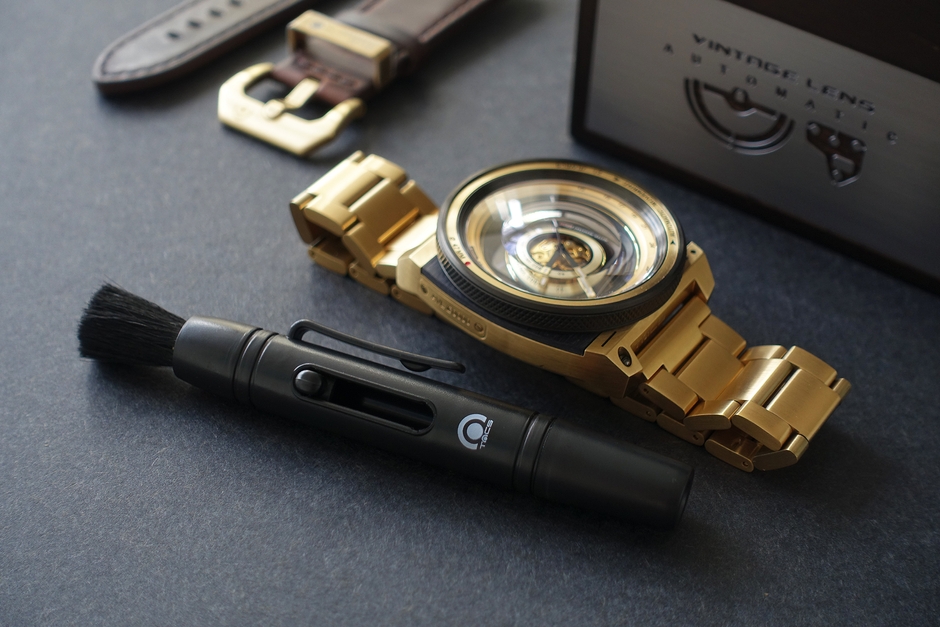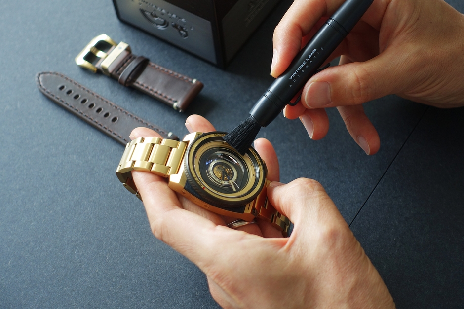 やわらかいブラシを格納式ブラシから出し、カメラレンズのように風防のホコリやゴミを綺麗に取り除くことができます。普段のお手入れが楽しくなるアイテムです。