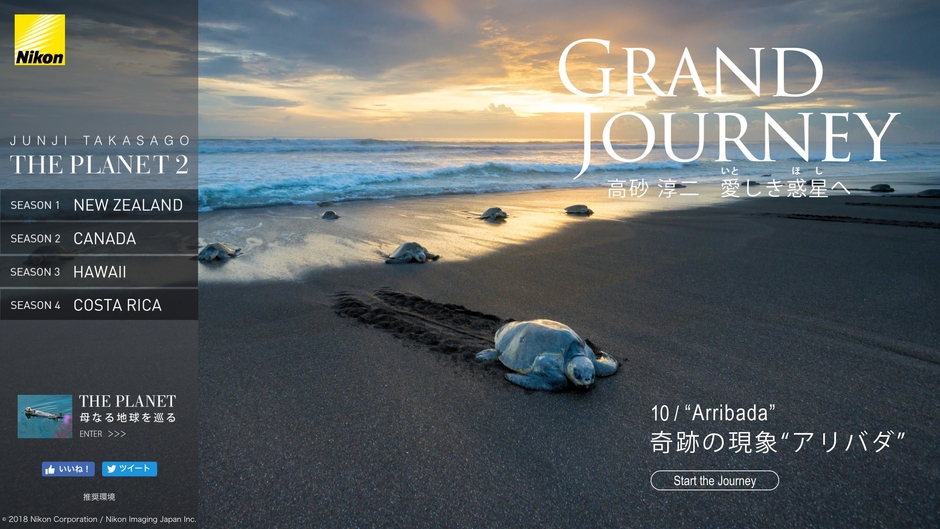 全12回にわたってお届けする「THE PLANET 2」第10回のテーマは「“Arribada” -a wonder in nature- 奇跡の現象“アリバダ”」です。中米コスタリカの太平洋岸にあるオスティオナルに何十万頭にもおよぶヒメウミガメが産卵のためにやってくる、“アリバダ”と呼ばれる現象の模様を、フルサイズ(ニコンFXフォーマット)ミラーレスカメラ「Z 7」、ニコンデジタル一眼レフカメラ「D5」を用いて撮影しました。写真集をめくるようなイメージで、ニコンのテクノロジーと高砂氏の豊かな感性が融合した作品によるストーリーをお楽しみいただけます。