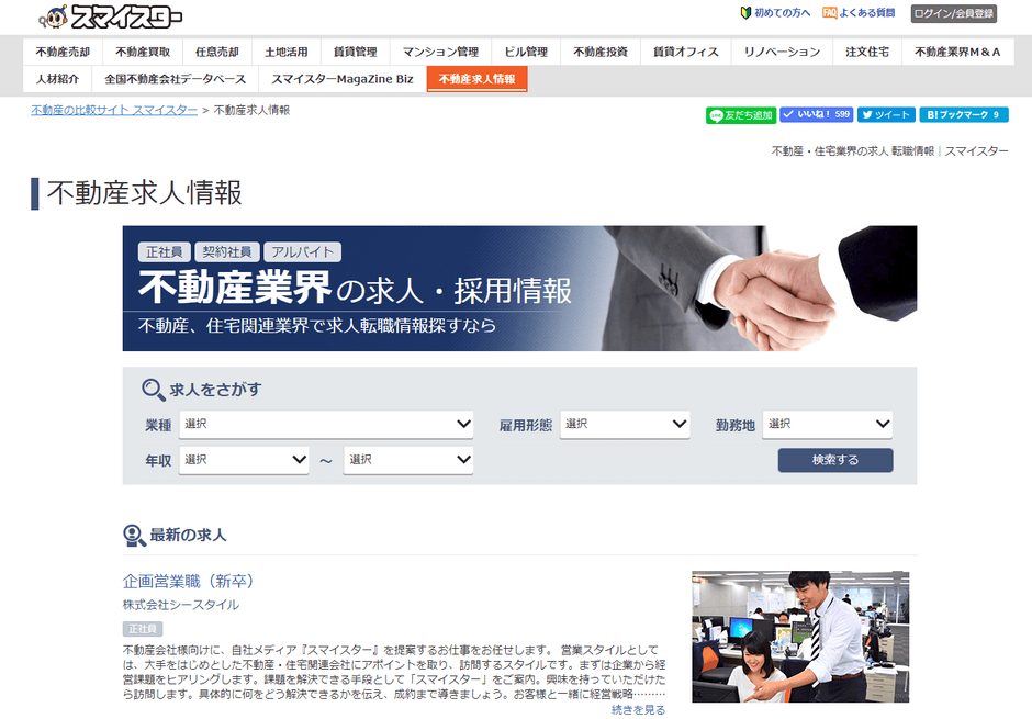 不動産関連サービスの総合比較ポータルサイト。2006年運営開始で現在掲載企業数約1,600社。対応カテゴリは、不動産売却、任意売却、不動産買取、土地活用、賃貸管理、リノベーション、人材紹介、不動産求人、スマイスターMagaZine Bizなど。