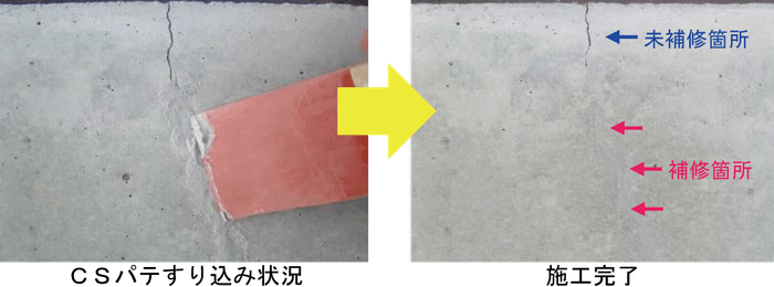 CS-21クリアーは、ひび割れ部に浸透させることによりコンクリート表層部を緻密化させ、ひび割れ自閉効果を促進します。