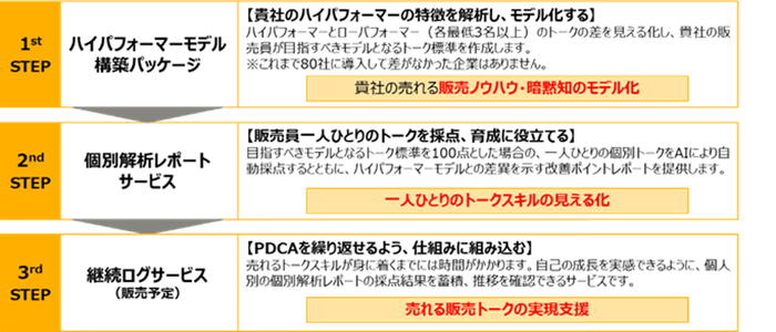 本サービスは音声認識、スクリーニング技術、AI解析など先端テクノロジーを活用し、「ハイパフォーマーモデル構築パッケージ」、「個別解析レポートサービス」、「継続ログサービス(予定)」の3ステップでサービスを提供いたします。外資系大手ラグジュアリーブランド及び国内大手紳士服ブランド等アパレル業界での展開に加えて、他業界においてもAIによるトーク解析・診断のアルゴリズム構築を積極的に推進しております。