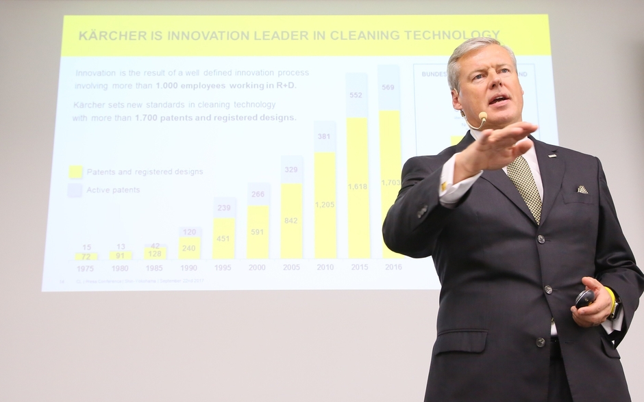 同日行われた経営戦略発表会ではアルフレッド・ケルヒャー社CEO ケルヒャー ジャパン株式会社 代表取締役会長 ハルトムート・イエナーから今後、世界中で更なるデジタル化を推し進めていくことで、IoTプラットフォームの小売販売など世界中の清掃を効率的に行えるソリューションを提供していくと発表。ケルヒャー ジャパン株式会社 代表取締役社長 佐藤八郎からは経営戦略を発表し、2020年に向けた中期経営計画で掲げたカスタマーセントリック(お客様中心主義)の実現に向け、家庭用製品においては市場拡大のため高圧洗浄機市場の更なる深耕、屋内製品市場への積極参入、地域・店舗営業の強化を、業務用製品においては専門性の向上・潜在ニーズ発掘のため各業界に特化した営業体制強化を発表しました。