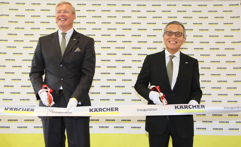 また家庭用・業務用製品を展示するケルヒャーセンターでは移転完了を記念したオープニングセレモニーが開催され、会長 ハルトムート・イエナーと代表取締役社長 佐藤八郎によるテープカットが行われました。
