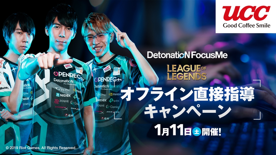 UCC上島珈琲株式会社(本社/神戸市、資本金/10億円、社長/朝田文彦)は、スポンサー契約を締結するeスポーツ ※1)のプロチーム「DetonatioN Gaming」との共同企画として、プロを目指す若者を中心としたユーザーを対象に、「League of Legends ※2)」部門のチーム「DetonatioN FocusMe」による直接指導が受けられる“eスポーツ講習会”を、2020年1月11日(土)に東京都内で開催します。