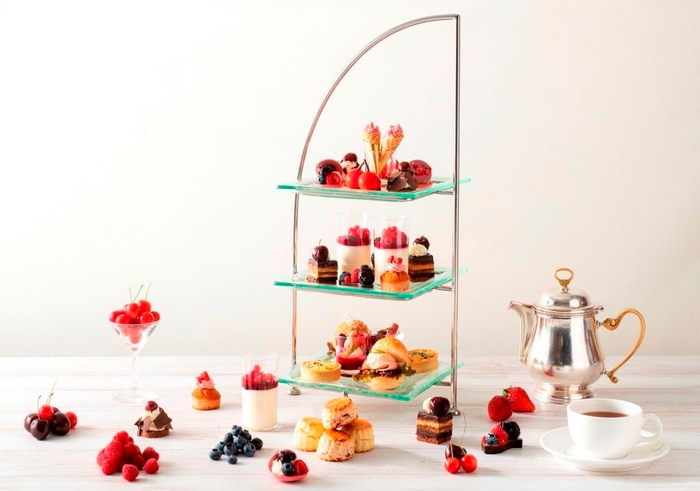 旬のチェリーをはじめ、ラズベリーやブルーベリーの香りと甘酸っぱさを最大限に引き出した目にも楽しい8種のプティフールとセイボリーが楽しめるアフタヌーンティーが登場。赤いグラサージュをまとった「グリオットムース」をはじめ、3種のベリーをサンドした「ベリーベリーマカロン」、キルシュを染み込ませた生地に生クリームとチェリー、チョコレートを飾ったフランスの伝統菓子「フォレノワール」など、パティシエによりひとつひとつ丁寧に作られるバラエティ豊かなプティフールを盛り合わせました。華やかで心躍る見た目の可愛いらしさはもちろんのこと、趣向を凝らしたセイボリーまで、一品ごとに異なる甘味と酸味、塩味のバランスの妙をお楽しみいただけます。