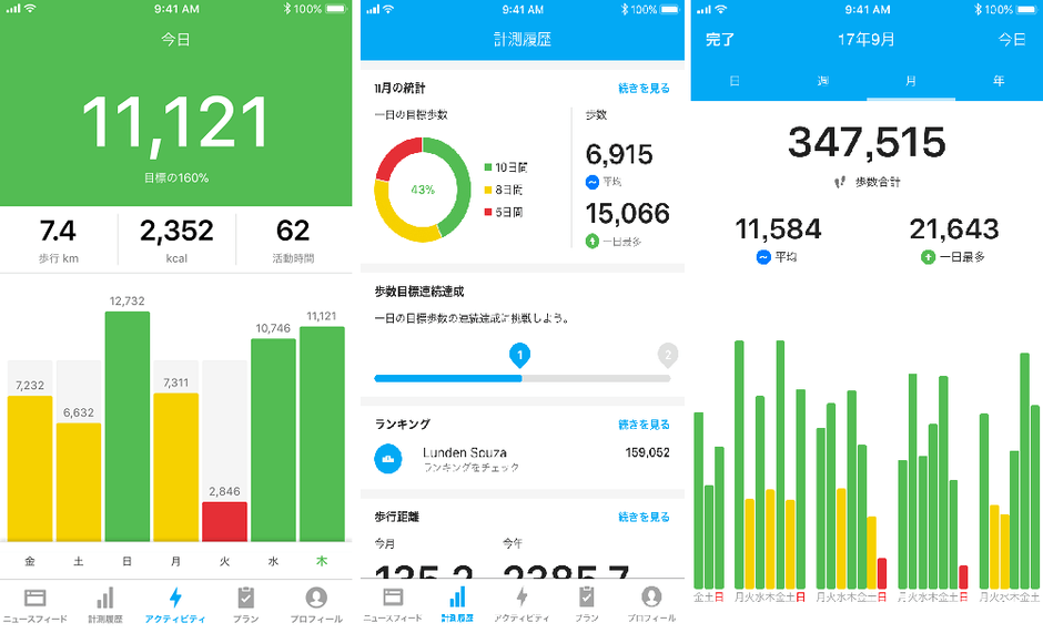 ・月の統計:該当する月の歩数目標達成ごとの日数(赤は目標の50%未満、黄は50%~99%、緑は目標を100%達成)や、平均歩数、一日の最多歩数が表示されます。