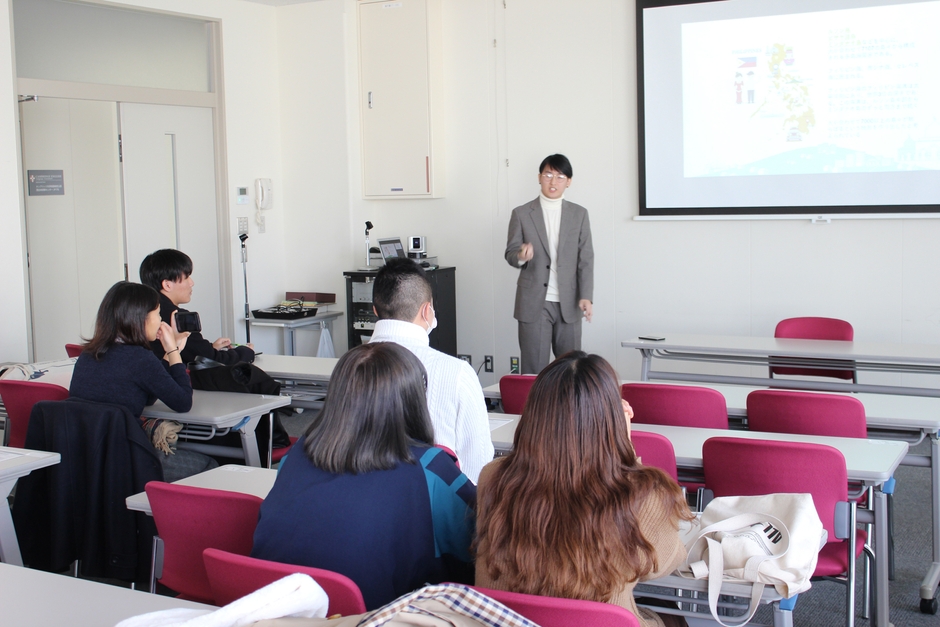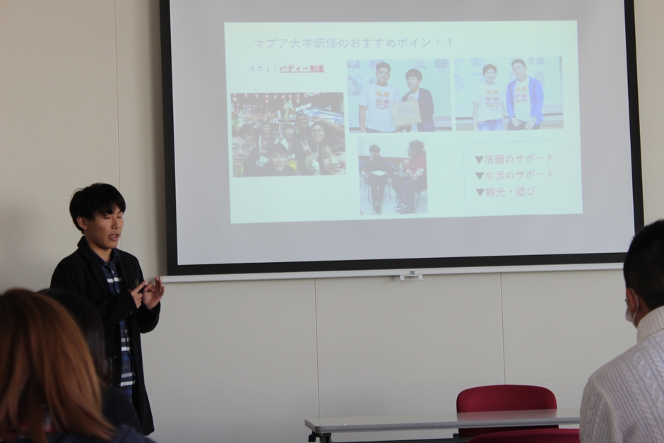 研修を経験した理学部基礎理学科2年浅川大生さんが、平日は午前中が英語授業、午後は文化活動などのアクティビティであることを紹介。土日はバディーの学生と一緒にバスケットボールをしたり観光地に行き、「楽しみながら英語の勉強ができ、フィリピンの友達もできた」と報告。マプア大学からの韓国人留学生カク・スンチャンさんは、マプア大学が多くの海外大学と提携していることやフィリピンの地理、文化について話し、出席学生が聞き入っていました。