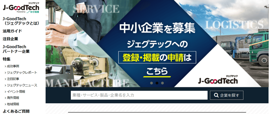 独立行政法人中小企業基盤整備機構(本社:東京都港区、理事長:高田 坦史)が運営するWebマッチングサイト「J-GoodTech(ジェグテック)」では、国内外へ自社情報を発信し、新たな販路拡大を目指す掲載企業を募集しています。掲載料・利用料はすべて無料です。海外企業や大手企業とのマッチング、国内の中小企業同士での技術提携や販売提携、異分野進出、海外展開等のビジネスパートナー探しに活用できるサービスです。