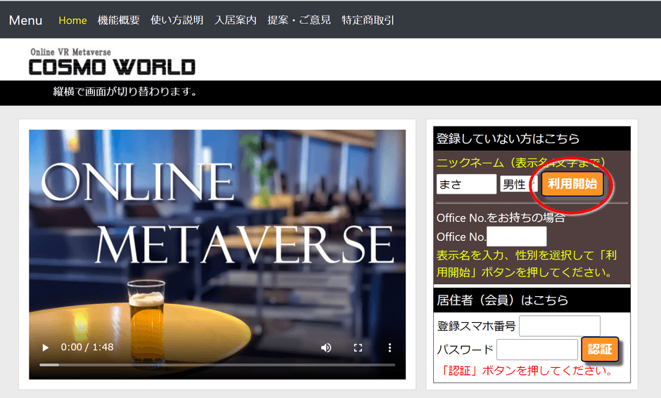 ・サイトに入り、ニックネームと性別を選んで利用開始ボタンを押してください。