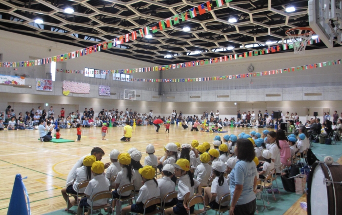 5歳児までの教育保育に取り組んでいる御影インターナショナルこども園(神戸市東灘区、西野雅二園長)は、2018年9月29日、神戸市の神戸学院大学附属中学校・高等学校体育館で「第5回運動会」を開催しました。