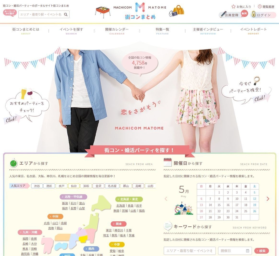 全国の「街コン」の開催情報を網羅しており、様々な街コンを見つけることが可能です。