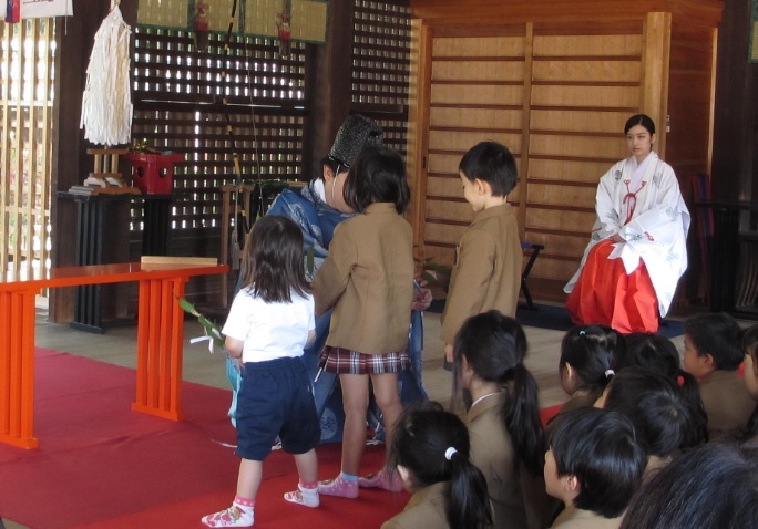 神社では、鳥居で一礼してから手を清め、本殿に上がりました。本殿では神妙に頭を下げてお祓いを受け、代表の園児3人が神職の方に教えていただきながら玉串拝礼をしました。