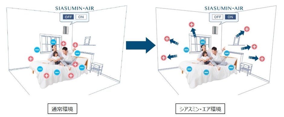 空気イオンは、酸化粒子であるプラスイオンが酸化現象を引き起こし身体に悪影響を及ぼします。《シアスミン・エア》導入前後で室内空気中のプラスイオン数とマイナスイオン数の変化を測定した結果、導入後はマイナスイオン数をほぼ維持しながら、プラスイオン数が大幅に減少。プラスイオン約20%に対して、マイナスイオンが約80%を占める室内環境となり、疲労回復、アンチエイジングをはじめとしたさまざまなマイナスイオン効果を発揮します。