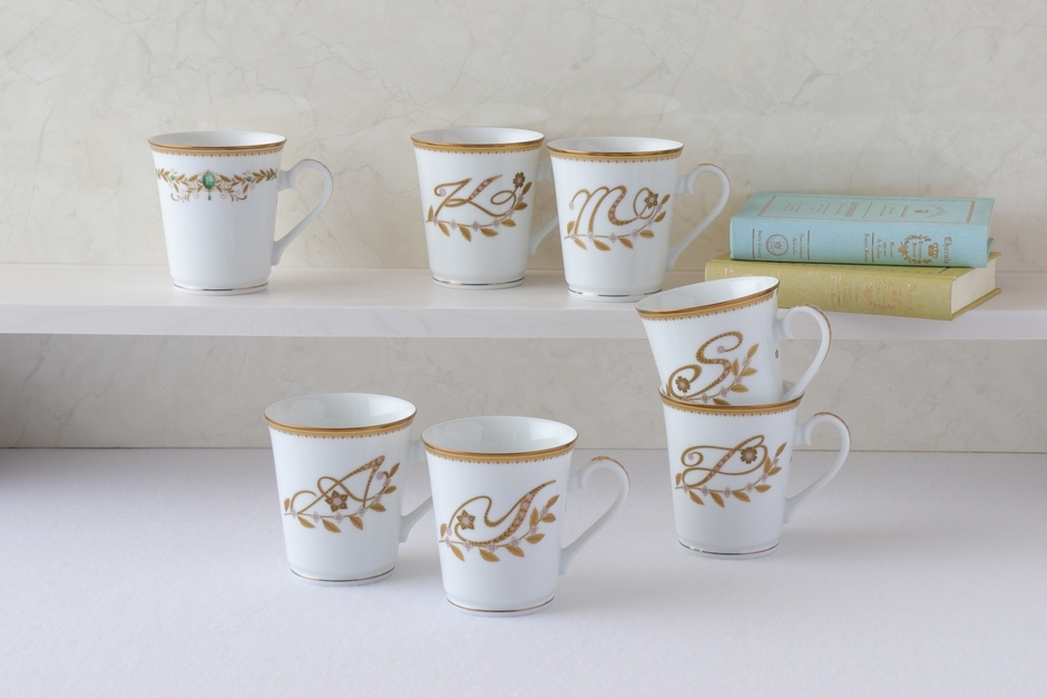 美しく煌びやかなジュエリーをモチーフにロマンティックなデザインを呈した「INIT〈イニット〉イニシャルマグカップ」と「Atene〈アテネ〉マグカップ」。手にした人に「自分自身がかけがえのない存在である」ことを気づいてもらえるよう7つのストーリーと3つの希望のメッセージを込めています。