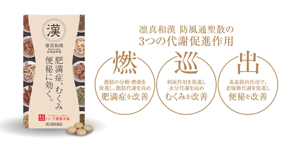 - 凛真和漢〔防風通聖散〕は、18種の生薬成分の「燃やす×巡らす×出す」作用で、脂肪・水分・老廃物代謝を高め、肥満症、むくみ、便秘に効く和漢薬です。
