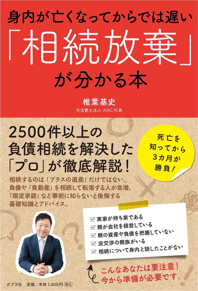 「負債相続」支援を専門的に手がける、司法書士法人ABC(本店所在地:大阪府大阪市中央区、代表:椎葉 基史)は、代表・椎葉が著者の新刊書籍『身内が亡くなってからでは遅い「相続放棄」が分かる本』(ポプラ社刊)が2018年2月16日に発刊されることを本日発表します。