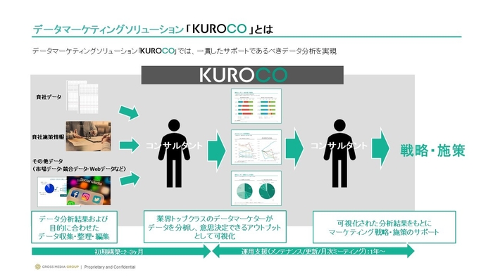 『KUROCO』は、データマーケティングツールでありながら、データ分析に精通したコンサルタントが、そのノウハウを駆使して分析設計からマーケティング支援までを一貫して行います。「データをどう分析するのか」はもちろん「データをどうマーケティングに活用するのか」まで踏み込んで、データの収集・整理・編集~可視化を行い、さらにその結果に基づいたマーケティング支援まで行うため、確実に効果の出るデータ活用が実現できます。