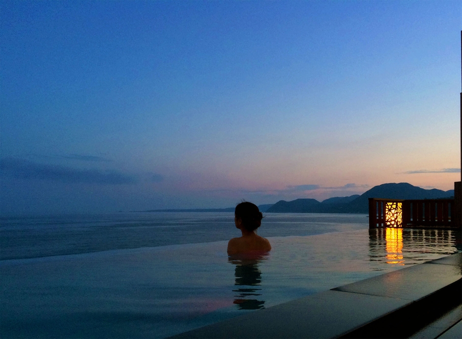 女性大浴場に併設した露天風呂は、大海原を見下ろすことができる最上階7階に位置しています。しかし、かねてから“湯船に浸かると海が見えない”というご指摘をいただいておりました。今回、海に面して建つロケーションを最大限に生かすことをコンセプトに、大きな湯船を海側ギリギリに設けたインフィニティ風呂にリニューアル。水平線と対座する解放感、海を眼下にした至福の一時、そんな露天風呂に一新しました。