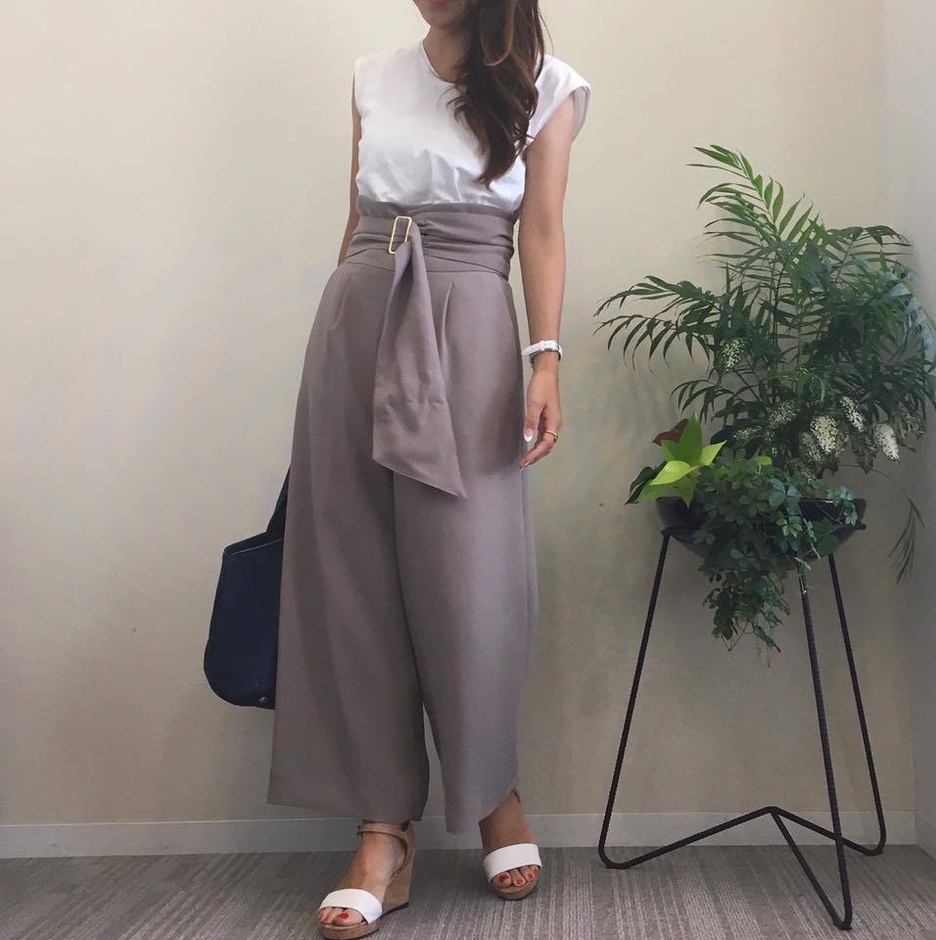 手洗い可能なサッシュベルトが今年らしいハイウエストパンツ。ベルトを外して折って履くことも出来る2Wayパンツです。さらりとした生地感と後ウエストゴムで履き心地、足さばきも抜群です。