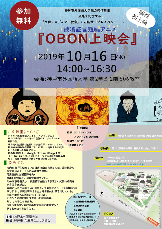 「神戸市外国語大学魅力発信事業※」の一環として、11月から全3回の講演会『原爆を記憶する 〜「文化・メディア・教育」の可能性〜』を開催します。そのプレイベントとして、被爆体験者の声をもとに製作した短編アニメ「OBON」の上映会を行います。この映画は映画祭DOXS Duisburgの「Grosse Klappe」賞、「Filme im Schloss」のドイツアニメ最優秀作品賞など、海外の映画祭で多数受賞した作品で、関西では初の上映です。